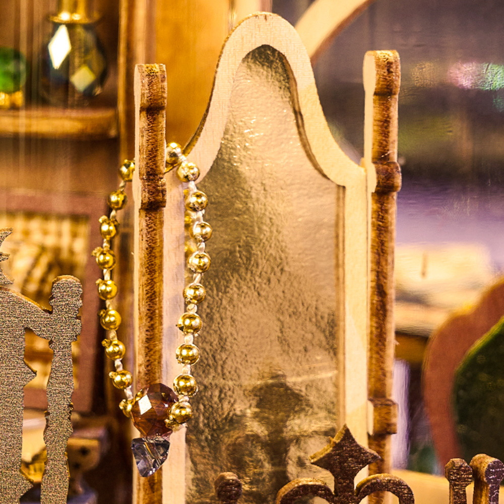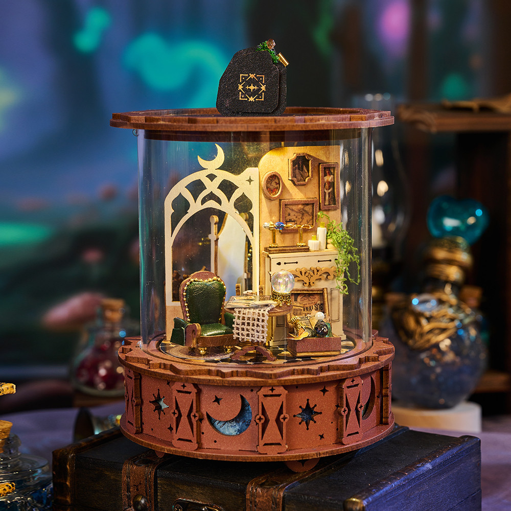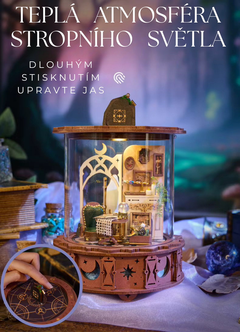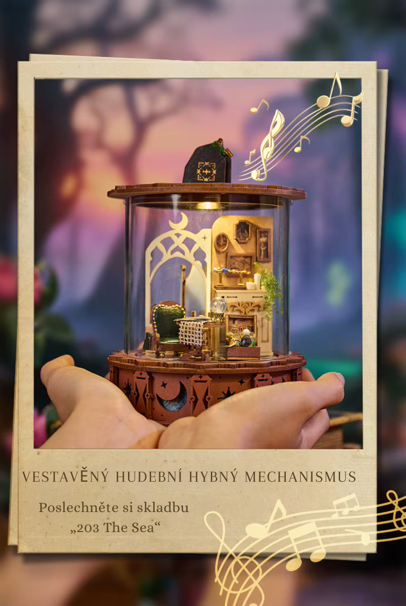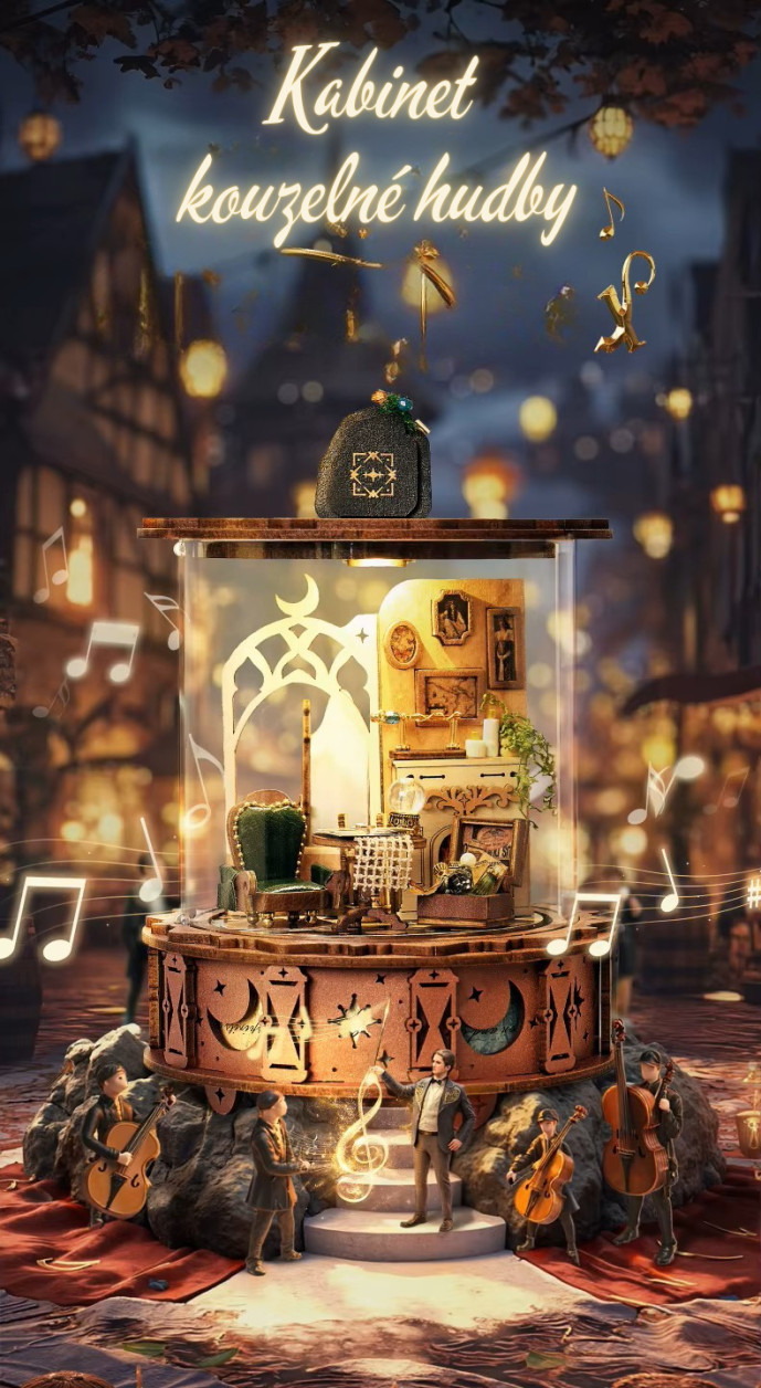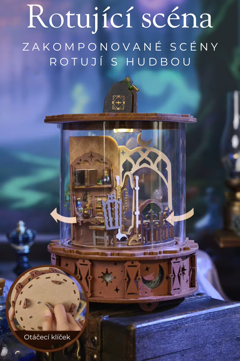 Skrinka funguje na mechanický princíp – po natiahnutí kľúčika sa rozozvučí melódia a celý kabinet ožije. Teplé LED osvetlenie zvýrazňuje drobné detaily a vytvára útulnú, až rozprávkovú atmosféru. Každý prvok má svoje miesto a celok pôsobí ako malý vystavený klenot pod sklenenou kupolou. Stavebnica je určená pre dospievajúcich a dospelých, ktorí si chcú užiť radosť z tvorenia a výsledný objekt používať ako dekoráciu, relaxačný prvok alebo originálny darček. Kabinet čarovnej hudby nie je len model – je to zážitok.