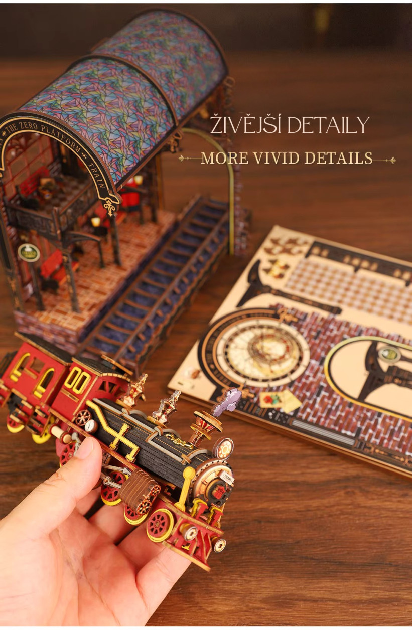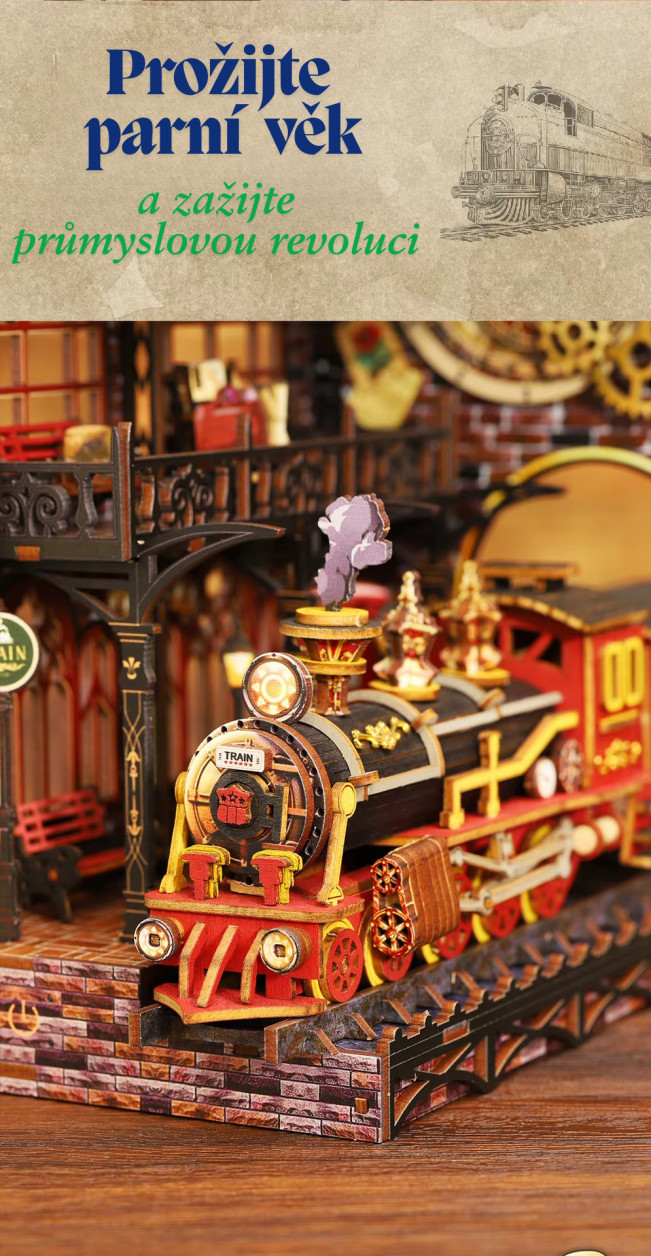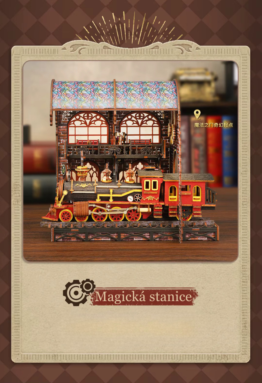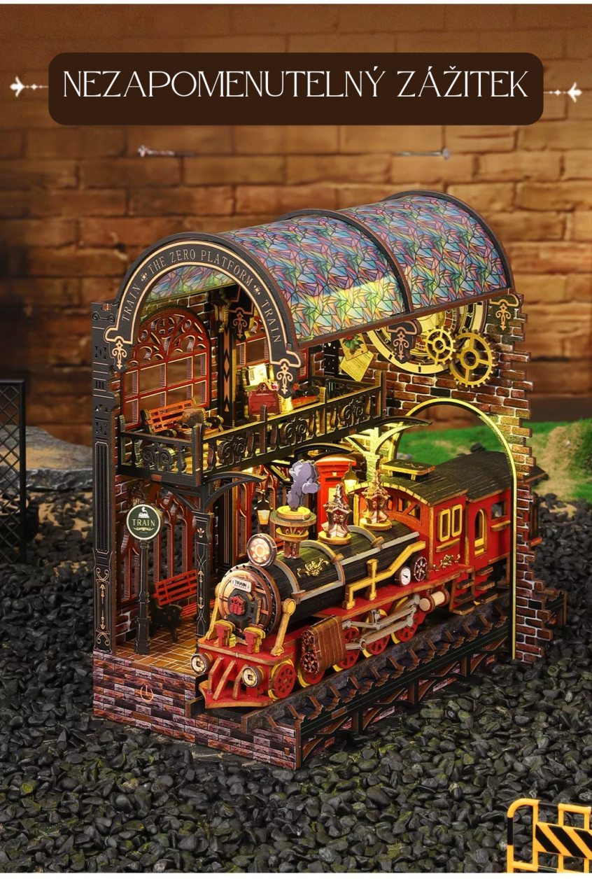 Vydejte sa na cestu, ktorá nevedie po mape, ale medzi svetmi. Model - Nástupište medzi svetmi predstavuje jedinečný booknook inšpirovaný steampunkovou estetikou, kde sa snúbi historická železnica s prvkami magie a cestovania medzi dimenziami. Dominantou scény je detailná lokomotíva prichádzajúca na nástupište, nad ktorým sa otvára zázračný portál. Tento prvok vytvára ilúziu brány do iného sveta – miesta, kde čas a priestor strácajú svoje hranice. Bohaté detaily, ozubené kolesá a architektonické prvky dodávajú modelu autentický a živý vzhľad. Sestavovanie je nielen kreatívnou činnosťou, ale aj formou relaxácie, ktorá vás vtiahne do procesu tvorby. Po dokončení získate výraznú dekoráciu, ktorá medzi knihami pôsobí ako skrytý príbeh čakajúci na objavenie.