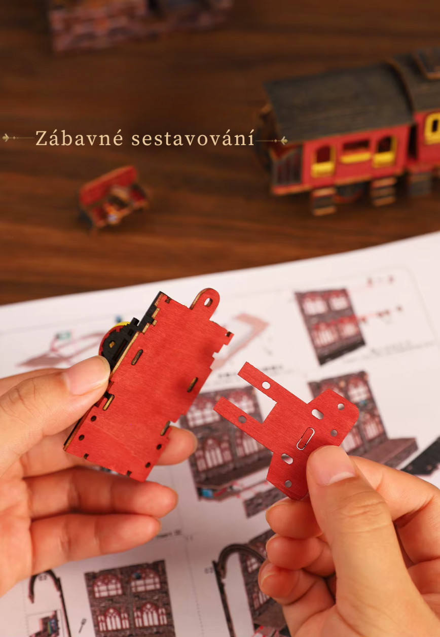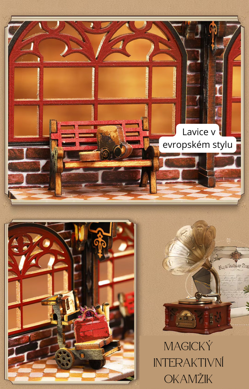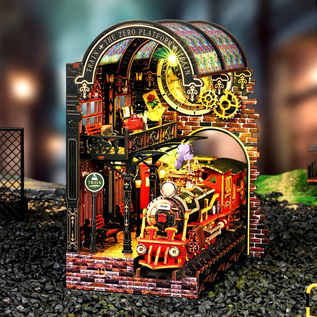 Vydejte sa na cestu, ktorá nevedie po mape, ale medzi svetmi. Model - Nástupište medzi svetmi predstavuje jedinečný booknook inšpirovaný steampunkovou estetikou, kde sa snúbi historická železnica s prvkami magie a cestovania medzi dimenziami. Dominantou scény je detailná lokomotíva prichádzajúca na nástupište, nad ktorým sa otvára zázračný portál. Tento prvok vytvára ilúziu brány do iného sveta – miesta, kde čas a priestor strácajú svoje hranice. Bohaté detaily, ozubené kolesá a architektonické prvky dodávajú modelu autentický a živý vzhľad. Sestavovanie je nielen kreatívnou činnosťou, ale aj formou relaxácie, ktorá vás vtiahne do procesu tvorby. Po dokončení získate výraznú dekoráciu, ktorá medzi knihami pôsobí ako skrytý príbeh čakajúci na objavenie.