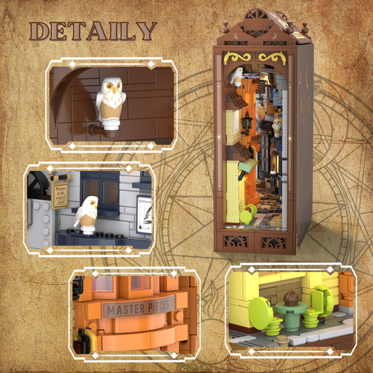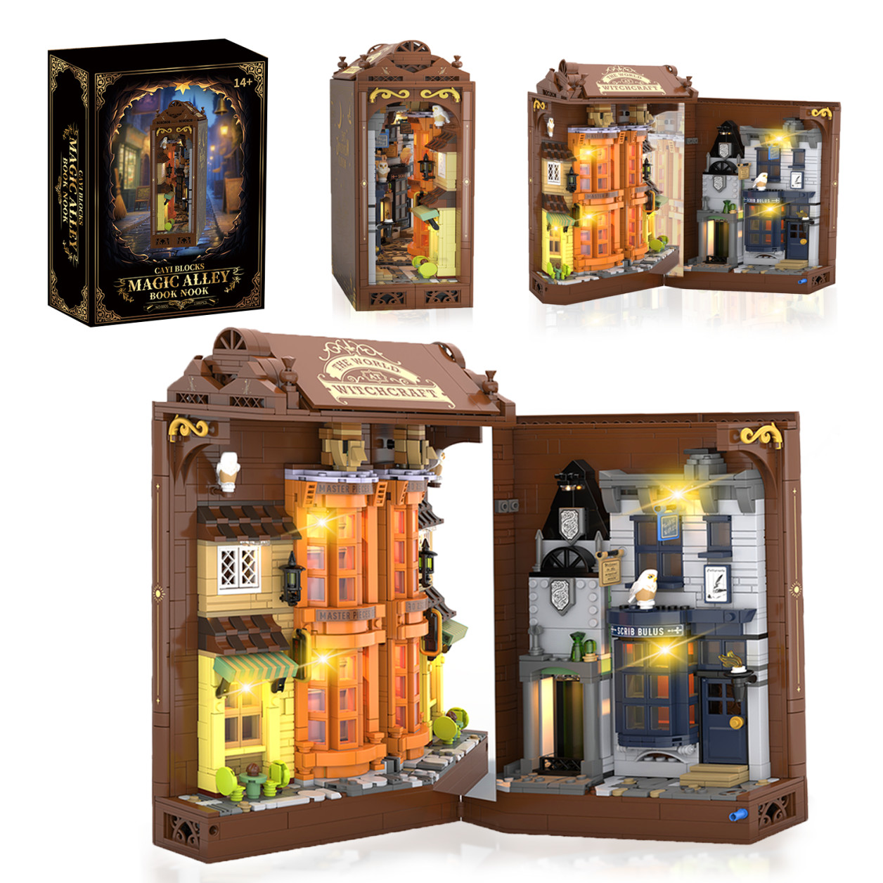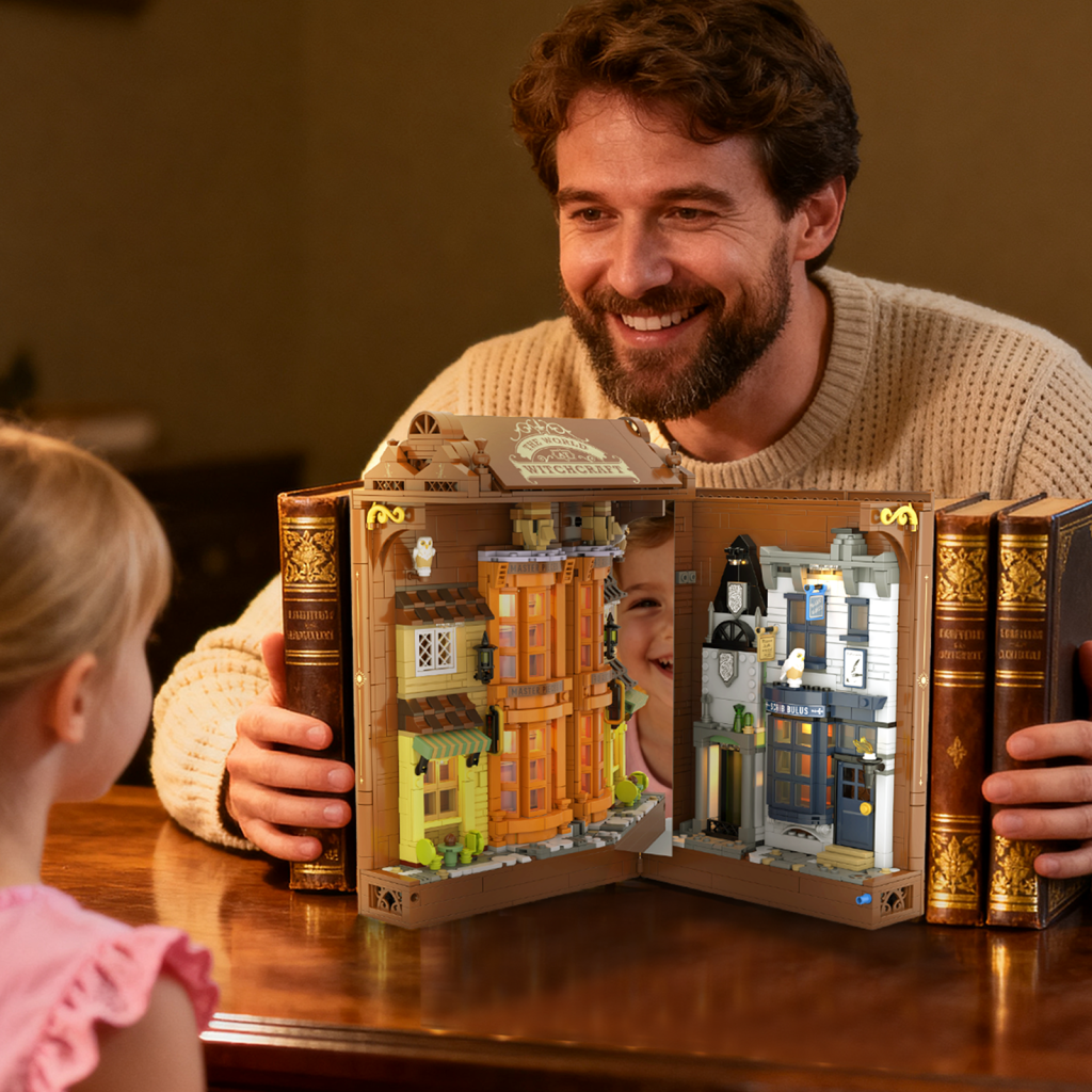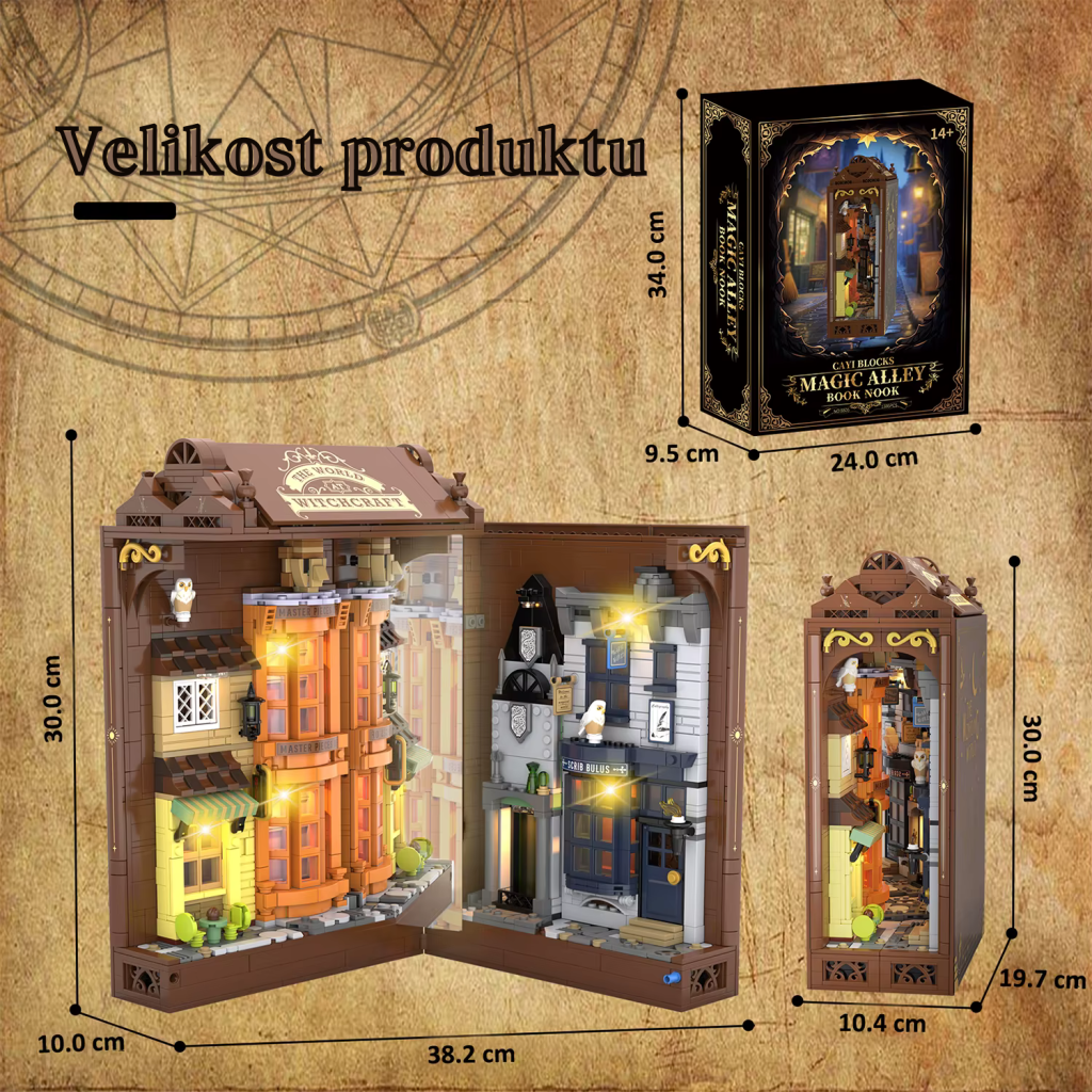 Ulička dávnych kúzel vás zavedie do kúzelníckej štvrti, kde sa za každými dverami skrýva príbeh. Úzke uličky, osvetlené výlohy a detailná architektúra vytvárajú atmosféru starého magického mesta, ktoré ožíva priamo vo vašej knižnici.