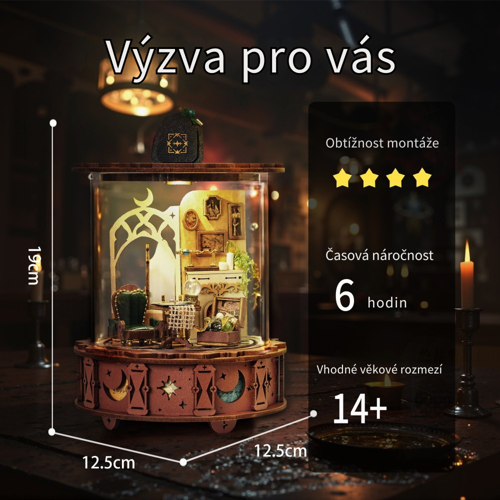 Skrinka funguje na mechanický princíp – po natiahnutí kľúčika sa rozozvučí melódia a celý kabinet ožije. Teplé LED osvetlenie zvýrazňuje drobné detaily a vytvára útulnú, až rozprávkovú atmosféru. Každý prvok má svoje miesto a celok pôsobí ako malý vystavený klenot pod sklenenou kupolou. Stavebnica je určená pre dospievajúcich a dospelých, ktorí si chcú užiť radosť z tvorenia a výsledný objekt používať ako dekoráciu, relaxačný prvok alebo originálny darček. Kabinet čarovnej hudby nie je len model – je to zážitok.