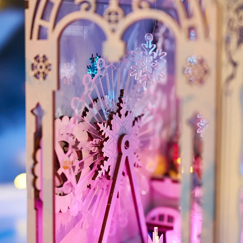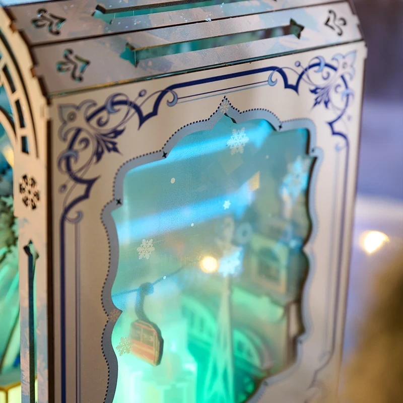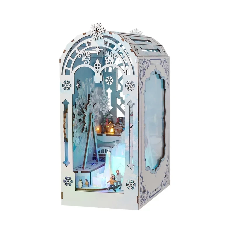 Hľadáte miesto, kde sa mráz premieňa v kúzlo? Nechajte sa vtiahnuť do tichého zimného sna, kde svetlá tancujú po strechách a každý detail dýcha ľadovým pokojom. Book Nook Ľadové mestečko od IIECREATE je malý zázrak medzi knihami – miniatúrna krajina, v ktorej čas spomalí a mráz rozžiari fantáziu. Z precízne laserom rezaných drevených dielov vzniká snová scenéria plná domčekov, lámp a drobných dekorácií, ktoré pod jemným LED osvetlením ožívajú ako miesto vo svetle zimného súmraku. Každý kúsok sa spája v jedinečný celok, ktorý rozvíja trpezlivosť, jemnú motoriku i estetické cítenie.