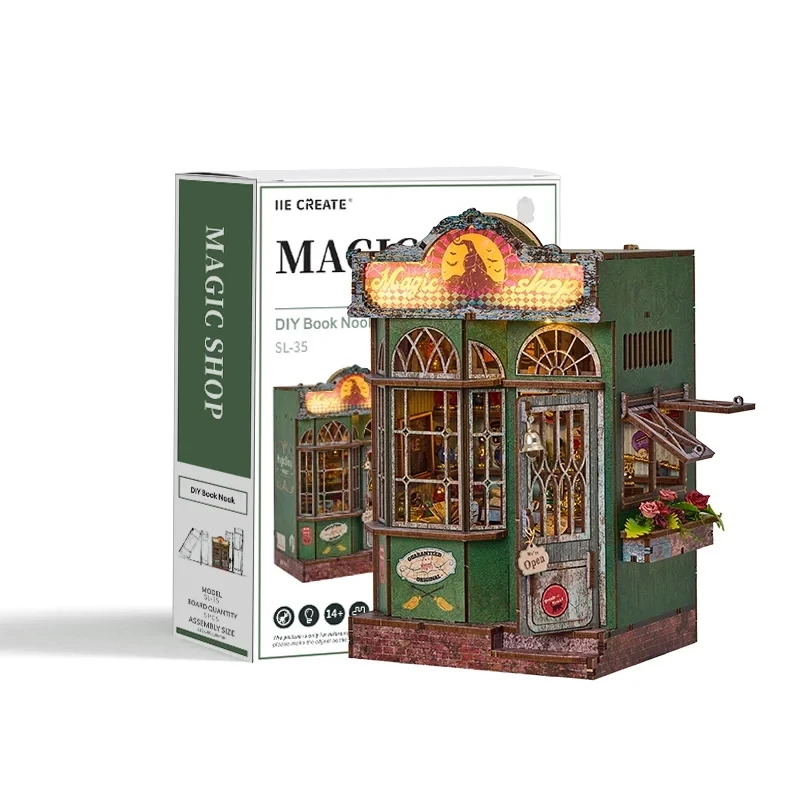 Obchod u čarovného klobúka je úchvatný booknook, ktorý dáva život tajomnému obchodu mágov, skrytému medzi stránkami Vašej knižnice. V jeho útrobách nájdete položky plné farebných fľaštičiek, svitkov, záhadných artefaktov a mesačného svetla, ktoré preniká zaprášenými oknami. Každý detail – od ozdobného pultu po jemné ornamenty na stenách – je navrhnutý tak, aby vyvolával dojem, že ste práve vkročili do sveta plného kúziel a tajomstiev. LED osvetlenie jemne presvetľuje svoje miesto medzi regálmi, odhaľuje skryté zákutia a vrhá jemné tiene, ktoré umocnia atmosféru. Montáž sady je magický rituál sám o sebe – ako spájate jednotlivé dielky, skládáte aj príbeh, ktorý začína žiariť vo vašich rukách. Hotový výsledok bude nielen dekoráciou, ale aj bránou do sveta, kde sa každý pohľad stáva výzvou k dobrodružstvu. Ideálny darček pre milovníkov fantasy, magie a detailných ručných projektov.
