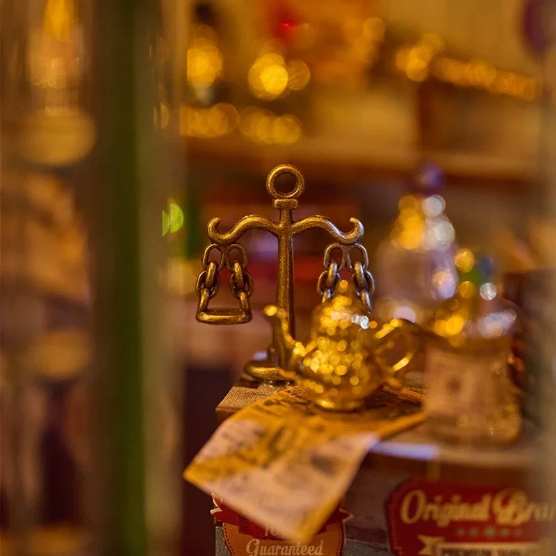 Na prvý pohľad zaujme dizajn malebného obchodu s arkádovým vchodom a výlohou plnou fľaštičiek a knižiek. Všetky detaily – plne vybavený pult, police s lektvármi, knihy, sviečky – vyvolávajú autentický dojem miniatúrneho miesta, kde mág pripravuje svoje elixíry.
