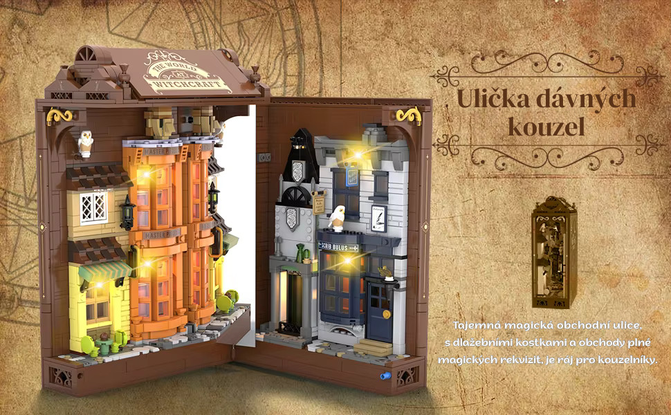 Ulička dávnych kúzel vás zavedie do kúzelníckej štvrti, kde sa za každými dverami skrýva príbeh. Úzke uličky, osvetlené výlohy a detailná architektúra vytvárajú atmosféru starého magického mesta, ktoré ožíva priamo vo vašej knižnici.
