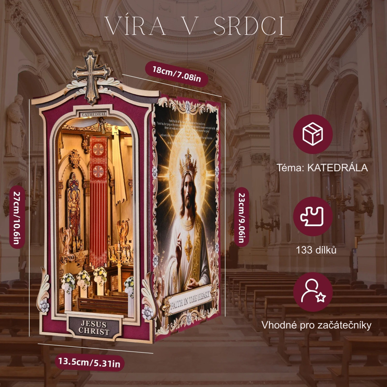 Knižný kútik je mini dioráma vložené medzi knihy na polici, ktoré vytvárajú ilúziu malého sveta ukrytého medzi knihami. Model Viera v srdci – Kostol zachytáva interiér pokojného sakrálneho priestoru. Dominantou je farebná vitráž, skrze ktorú preniká svetlo a vytvára jedinečnú atmosféru ticha a rozjímania. Detailné prvky interiéru, drevené konštrukcie a jemné osvetlenie evokujú pocit skutočného kostola. Po dokončení získate elegantnú dekoráciu knižnice, ktorá prináša pokoj, harmóniu a duchovný nádych do vášho domova.